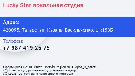 Lucky Star, вокальная студия по адресу 420095, Татарстан, Казань, Васильченко, 1 к153Б в дальнейшем Организация, размещена в следующих категориях: