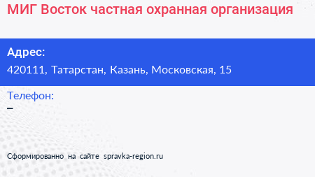 МИГ-Восток, частная охранная организация по адресу 420111, Татарстан, Казань, Московская, 15 в дальнейшем Организация, размещена в следующих категориях: