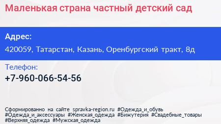 Маленькая страна, частный детский сад по адресу 420059, Татарстан, Казань, Оренбургский тракт, 8д в дальнейшем Организация, размещена в следующих категориях: