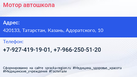 Мотор, автошкола по адресу 420133, Татарстан, Казань, Адоратского, 10 в дальнейшем Организация, размещена в следующих категориях: