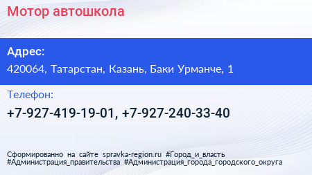 Мотор, автошкола по адресу 420064, Татарстан, Казань, Баки Урманче, 1 в дальнейшем Организация, размещена в следующих категориях: