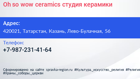 Oh, so wow ceramics, студия керамики по адресу 420021, Татарстан, Казань, Лево-Булачная, 56 в дальнейшем Организация, размещена в следующих категориях: