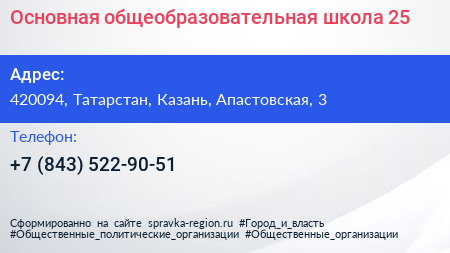 Основная общеобразовательная школа №25 по адресу 420094, Татарстан, Казань, Апастовская, 3 в дальнейшем Организация, размещена в следующих категориях: