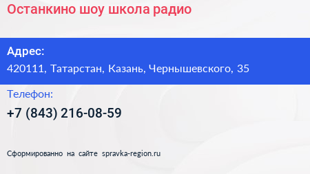 Останкино, шоу-школа радио по адресу 420111, Татарстан, Казань, Чернышевского, 35 в дальнейшем Организация, размещена в следующих категориях: