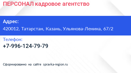 ПЕРСОНАЛ, кадровое агентство по адресу 420012, Татарстан, Казань, Ульянова-Ленина, 67/2 в дальнейшем Организация, размещена в следующих категориях: