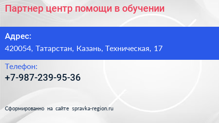 Партнер, центр помощи в обучении по адресу 420054, Татарстан, Казань, Техническая, 17 в дальнейшем Организация, размещена в следующих категориях: