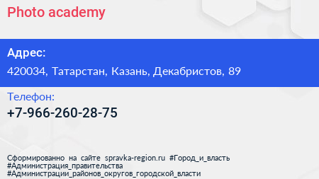 Photo academy по адресу 420034, Татарстан, Казань, Декабристов, 89 в дальнейшем Организация, размещена в следующих категориях: