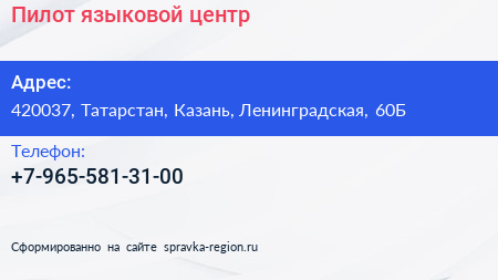 Пилот, языковой центр по адресу 420037, Татарстан, Казань, Ленинградская, 60Б в дальнейшем Организация, размещена в следующих категориях: