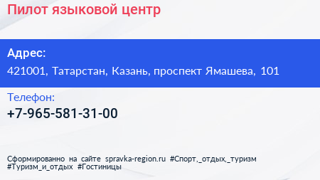 Пилот, языковой центр по адресу 421001, Татарстан, Казань, проспект Ямашева, 101 в дальнейшем Организация, размещена в следующих категориях: