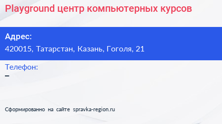 Playground, центр компьютерных курсов по адресу 420015, Татарстан, Казань, Гоголя, 21 в дальнейшем Организация, размещена в следующих категориях: