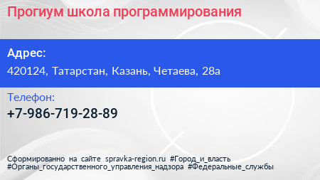 Прогиум, школа программирования по адресу 420124, Татарстан, Казань, Четаева, 28а в дальнейшем Организация, размещена в следующих категориях: