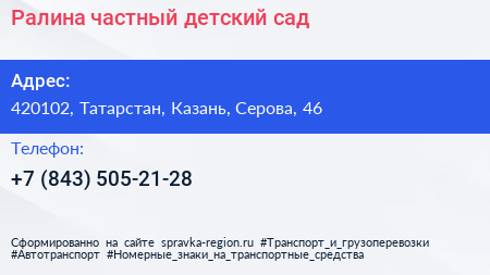 Ралина, частный детский сад по адресу 420102, Татарстан, Казань, Серова, 46 в дальнейшем Организация, размещена в следующих категориях: