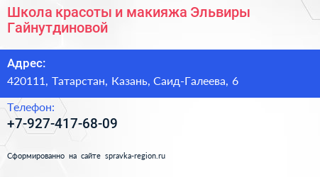 Школа красоты и макияжа Эльвиры Гайнутдиновой по адресу 420111, Татарстан, Казань, Саид-Галеева, 6 в дальнейшем Организация, размещена в следующих категориях: