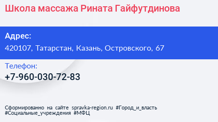 Школа массажа Рината Гайфутдинова по адресу 420107, Татарстан, Казань, Островского, 67 в дальнейшем Организация, размещена в следующих категориях: