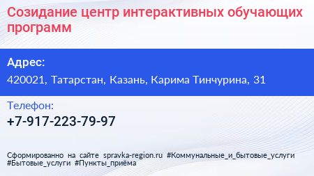 Созидание, центр интерактивных обучающих программ по адресу 420021, Татарстан, Казань, Карима Тинчурина, 31 в дальнейшем Организация, размещена в следующих категориях: