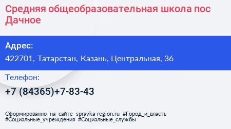 Средняя общеобразовательная школа, пос. Дачное по адресу 422701, Татарстан, Казань, Центральная, 36 в дальнейшем Организация, размещена в следующих категориях: