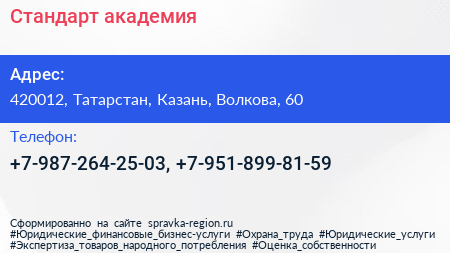 Стандарт, академия по адресу 420012, Татарстан, Казань, Волкова, 60 в дальнейшем Организация, размещена в следующих категориях: