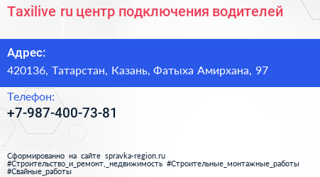 Taxilive.ru, центр подключения водителей по адресу 420136, Татарстан, Казань, Фатыха Амирхана, 97 в дальнейшем Организация, размещена в следующих категориях: