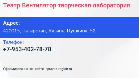 Театр-Вентилятор, творческая лаборатория по адресу 420015, Татарстан, Казань, Пушкина, 52 в дальнейшем Организация, размещена в следующих категориях: