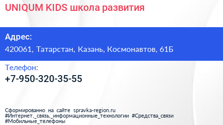 UNIQUM KIDS, школа развития по адресу 420061, Татарстан, Казань, Космонавтов, 61Б в дальнейшем Организация, размещена в следующих категориях: