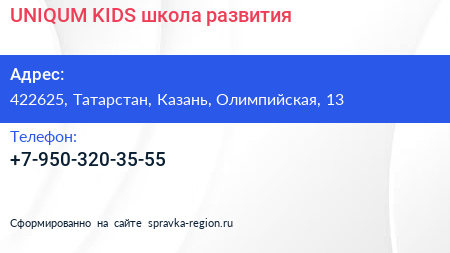 UNIQUM KIDS, школа развития по адресу 422625, Татарстан, Казань, Олимпийская, 13 в дальнейшем Организация, размещена в следующих категориях: