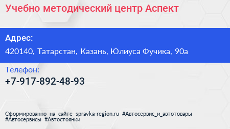 Учебно-методический центр Аспект по адресу 420140, Татарстан, Казань, Юлиуса Фучика, 90а в дальнейшем Организация, размещена в следующих категориях: