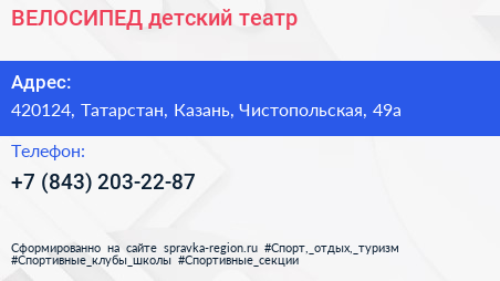 ВЕЛОСИПЕД, детский театр по адресу 420124, Татарстан, Казань, Чистопольская, 49а в дальнейшем Организация, размещена в следующих категориях: