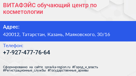 ВИТАФЭЙС, обучающий центр по косметологии по адресу 420012, Татарстан, Казань, Маяковского, 30/16 в дальнейшем Организация, размещена в следующих категориях: