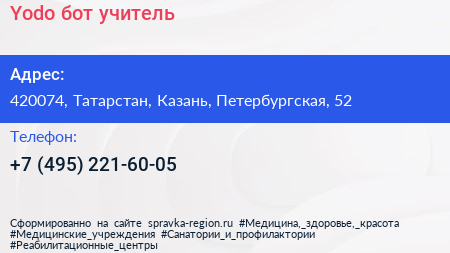 Yodo-бот учитель по адресу 420074, Татарстан, Казань, Петербургская, 52 в дальнейшем Организация, размещена в следующих категориях: