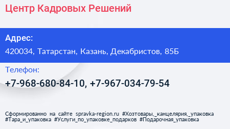 Центр Кадровых Решений по адресу 420034, Татарстан, Казань, Декабристов, 85Б в дальнейшем Организация, размещена в следующих категориях: