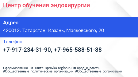 Центр обучения эндохирургии по адресу 420012, Татарстан, Казань, Маяковского, 20 в дальнейшем Организация, размещена в следующих категориях: