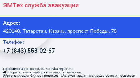 ЭМТех, служба эвакуации по адресу 420140, Татарстан, Казань, проспект Победы, 78 в дальнейшем Организация, размещена в следующих категориях: