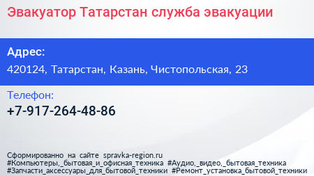 Эвакуатор Татарстан, служба эвакуации по адресу 420124, Татарстан, Казань, Чистопольская, 23 в дальнейшем Организация, размещена в следующих категориях: