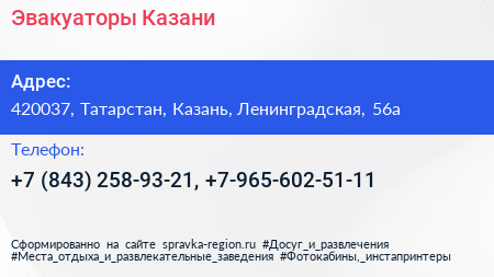 Эвакуаторы Казани по адресу 420037, Татарстан, Казань, Ленинградская, 56а в дальнейшем Организация, размещена в следующих категориях: