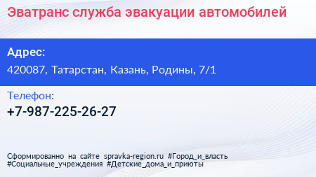 Эватранс, служба эвакуации автомобилей по адресу 420087, Татарстан, Казань, Родины, 7/1 в дальнейшем Организация, размещена в следующих категориях: