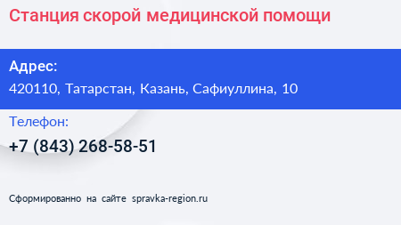 Станция скорой медицинской помощи по адресу 420110, Татарстан, Казань, Сафиуллина, 10 в дальнейшем Организация, размещена в следующих категориях: