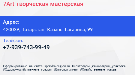 7Art, творческая мастерская по адресу 420039, Татарстан, Казань, Гагарина, 99 в дальнейшем Организация, размещена в следующих категориях: