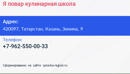 Я повар, кулинарная школа по адресу 420097, Татарстан, Казань, Зинина, 9 в дальнейшем Организация, размещена в следующих категориях: