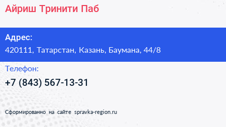 Айриш Тринити Паб по адресу 420111, Татарстан, Казань, Баумана, 44/8 в дальнейшем Организация, размещена в следующих категориях: