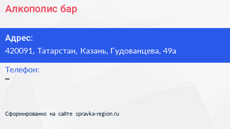 Алкополис, бар по адресу 420091, Татарстан, Казань, Гудованцева, 49а в дальнейшем Организация, размещена в следующих категориях: