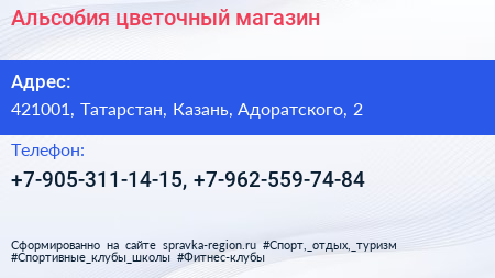 Альсобия, цветочный магазин по адресу 421001, Татарстан, Казань, Адоратского, 2 в дальнейшем Организация, размещена в следующих категориях: