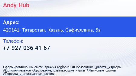 Andy Hub по адресу 420141, Татарстан, Казань, Сафиуллина, 5а в дальнейшем Организация, размещена в следующих категориях: