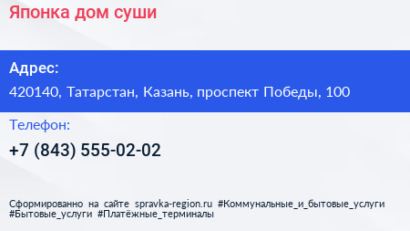Японка, дом суши по адресу 420140, Татарстан, Казань, проспект Победы, 100 в дальнейшем Организация, размещена в следующих категориях: