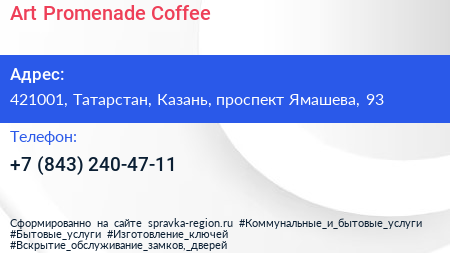 Art Promenade Coffee по адресу 421001, Татарстан, Казань, проспект Ямашева, 93 в дальнейшем Организация, размещена в следующих категориях: