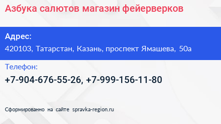 Азбука салютов, магазин фейерверков по адресу 420103, Татарстан, Казань, проспект Ямашева, 50а в дальнейшем Организация, размещена в следующих категориях: