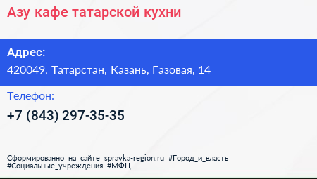 Азу, кафе татарской кухни по адресу 420049, Татарстан, Казань, Газовая, 14 в дальнейшем Организация, размещена в следующих категориях: