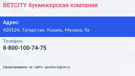 BETCITY, букмекерская компания по адресу 420124, Татарстан, Казань, Мусина, 9а в дальнейшем Организация, размещена в следующих категориях: