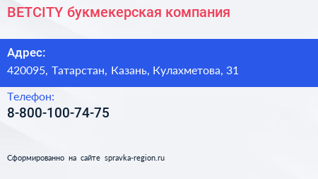 BETCITY, букмекерская компания по адресу 420095, Татарстан, Казань, Кулахметова, 31 в дальнейшем Организация, размещена в следующих категориях: