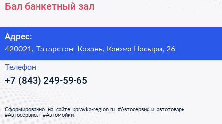 Бал, банкетный зал по адресу 420021, Татарстан, Казань, Каюма Насыри, 26 в дальнейшем Организация, размещена в следующих категориях:
