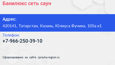 Банилюкс, сеть саун по адресу 420141, Татарстан, Казань, Юлиуса Фучика, 105а к1 в дальнейшем Организация, размещена в следующих категориях: